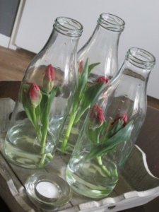 Tejes üvegekbe kedvenc tulipánunkból vagy tavaszi virágunkból rakjunk egy-egy rövid szálat.