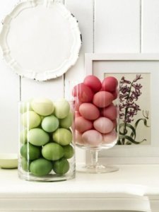 Rakjunk kézzel festett tojásokat, színek szerint magas vázákba.