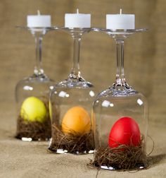 Lefedett talpas poharak alá tegyünk színes tojásokat, a talpakra pedig kedvenc illatos mécseseinket.